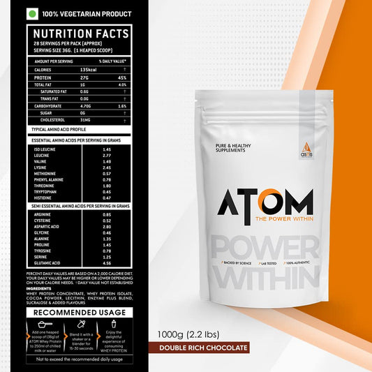 AS-IT-IS ATOM Whey Protein 1kg with Digestive Enzymes | USA Labdoor Certified for Accuracy & Purity | 27g protein | 5.7g BCAA